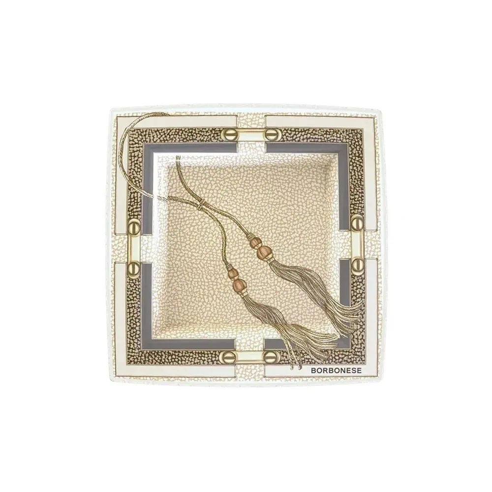 Svuota tasche in porcellana decorata con serigrafia applicata a mano e logo Borbonese. Il design è personalizzato dall’iconica texture “OP” Occhio di Pernice. Confezionato in scatola.