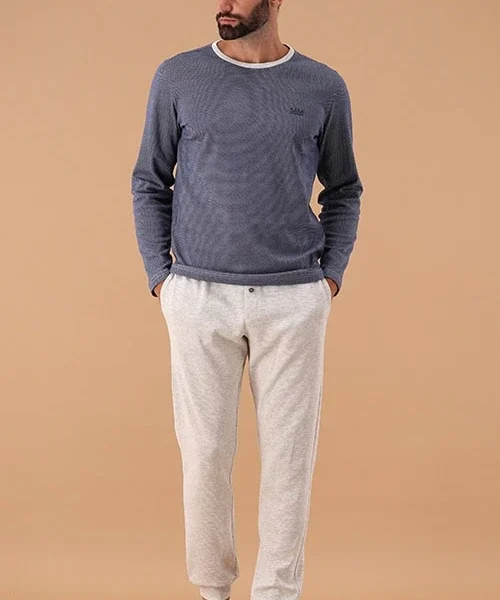 Pigiama da uomo in tessuto jacquard con classico collo serafino, con colletto in contrasto e scollatura con piccoli bottoni, ideale per un look rilassato ma sofisticato grazie anche ai piping sulla spalla. Il tessuto jacquard, noto per i suoi motivi intrecciati direttamente nella trama del tessuto, aggiunge un tocco di raffinatezza e texture. Il pantalone in contrasto si abbina perfettamente alla maglia ed è dotato di elastico in vita per il massimo comfort e libertà di movimento durante il riposo e tasche sul fianco. Nel complesso, questo pigiama unisce eleganza e funzionalità, perfetto per l’uomo che apprezza lo stile anche nei momenti di relax.