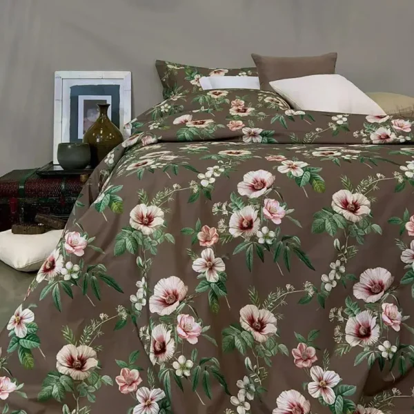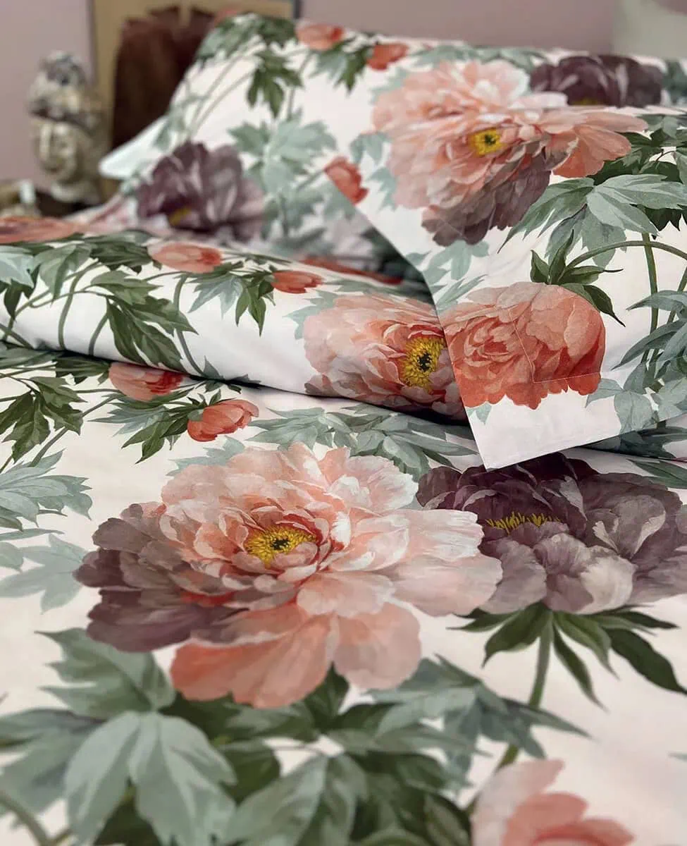Parure copripiumino matrimoniale 3 pezzi in raso di puro cotone con sopra sacca stampato all-over e retro tinta unita, federe a tre volani con fronte stampato e retro tinta unita.