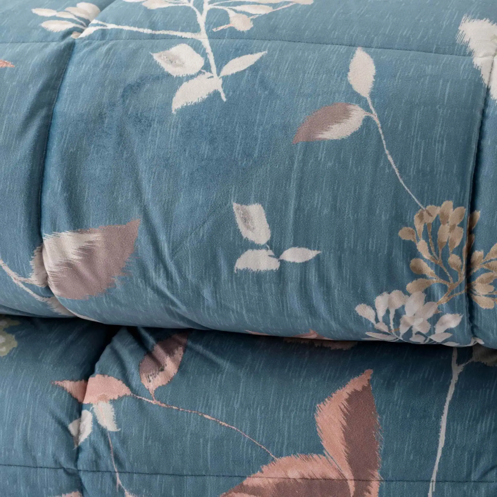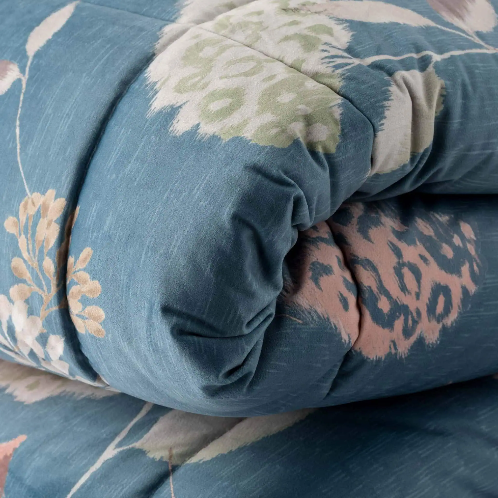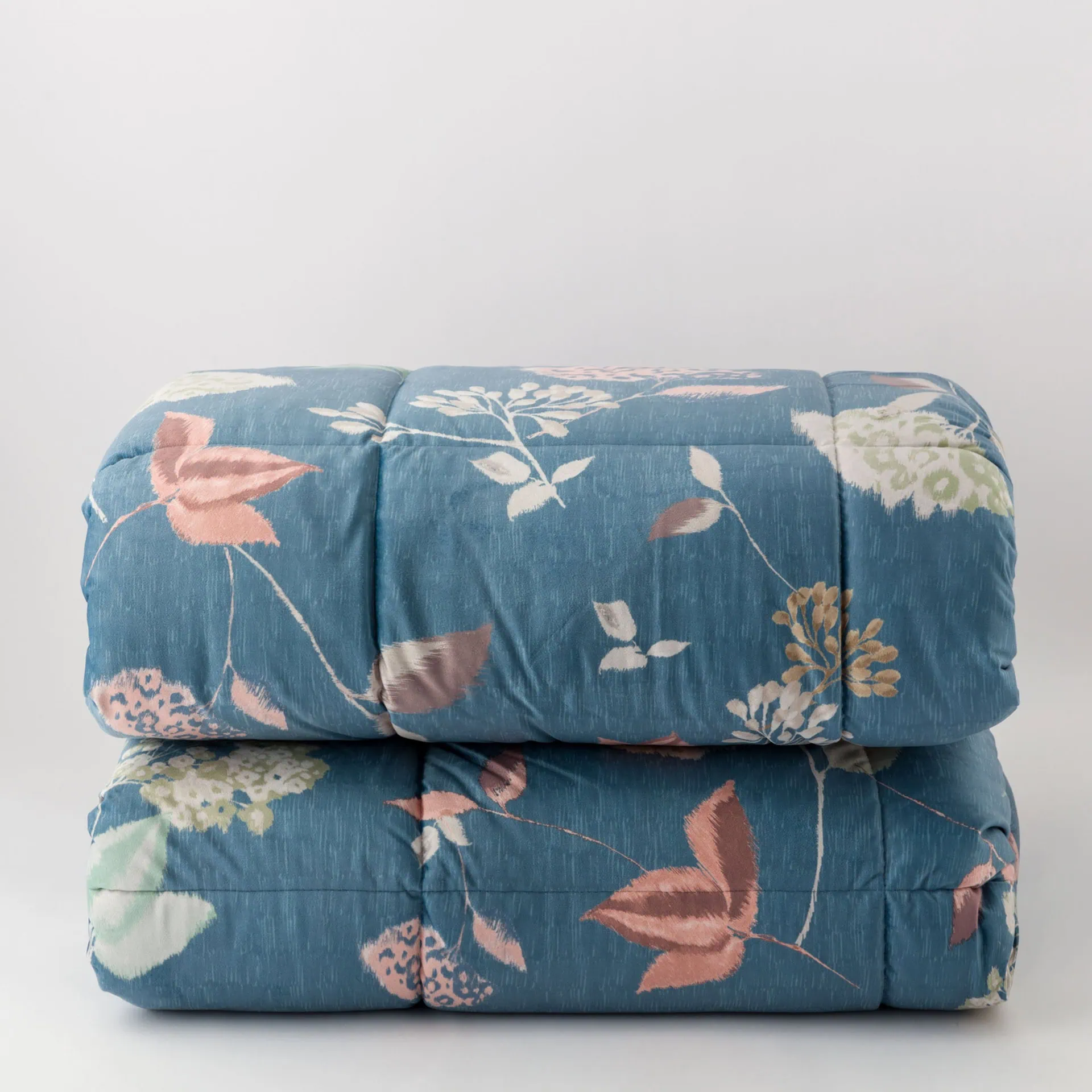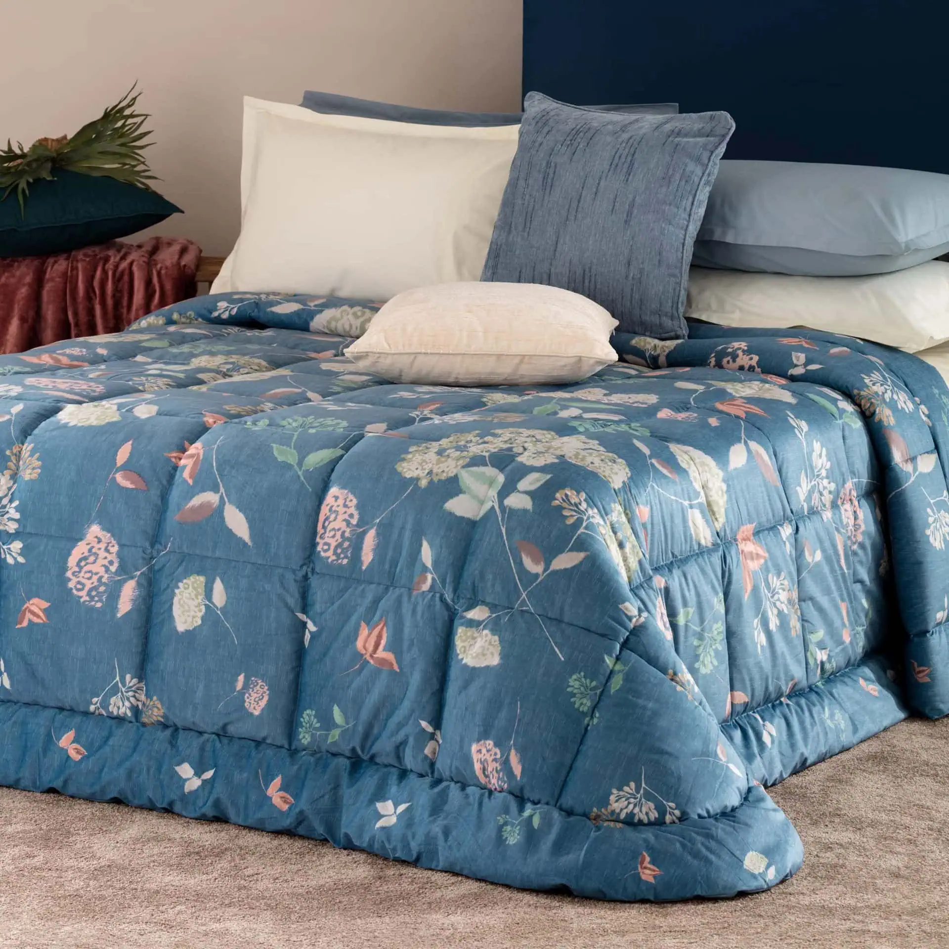 Il velluto del lato frontale, impreziosito da una stampa digitale ad alta definizione, regala una sensazione tattile calda e avvolgente, mentre il retro in puro cotone accoglie la pelle con naturale morbidezza. L’imbottitura generosa da 350 grammi per metro quadro garantisce un comfort ideale durante le notti più fredde, senza appesantire.