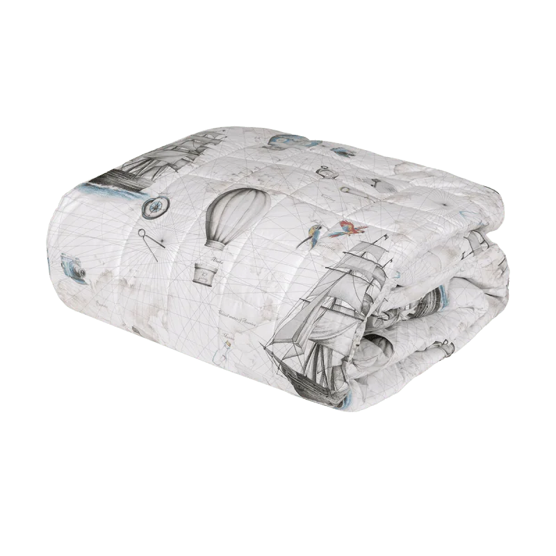 Il quilt MAGELLANO trasporta il letto in una dimensione fantastica che rievoca il tema del viaggio dei tempi antichi. Su uno sfondo che richiama vecchie carte di navigazione appaiono velieri, mongolfiere, cannocchiali, bussole e altri strumenti antichi con qualche uccello dal piumaggio colorato. Un letto accattivante per i più giovani, trasportati in una emozione senza tempo.
